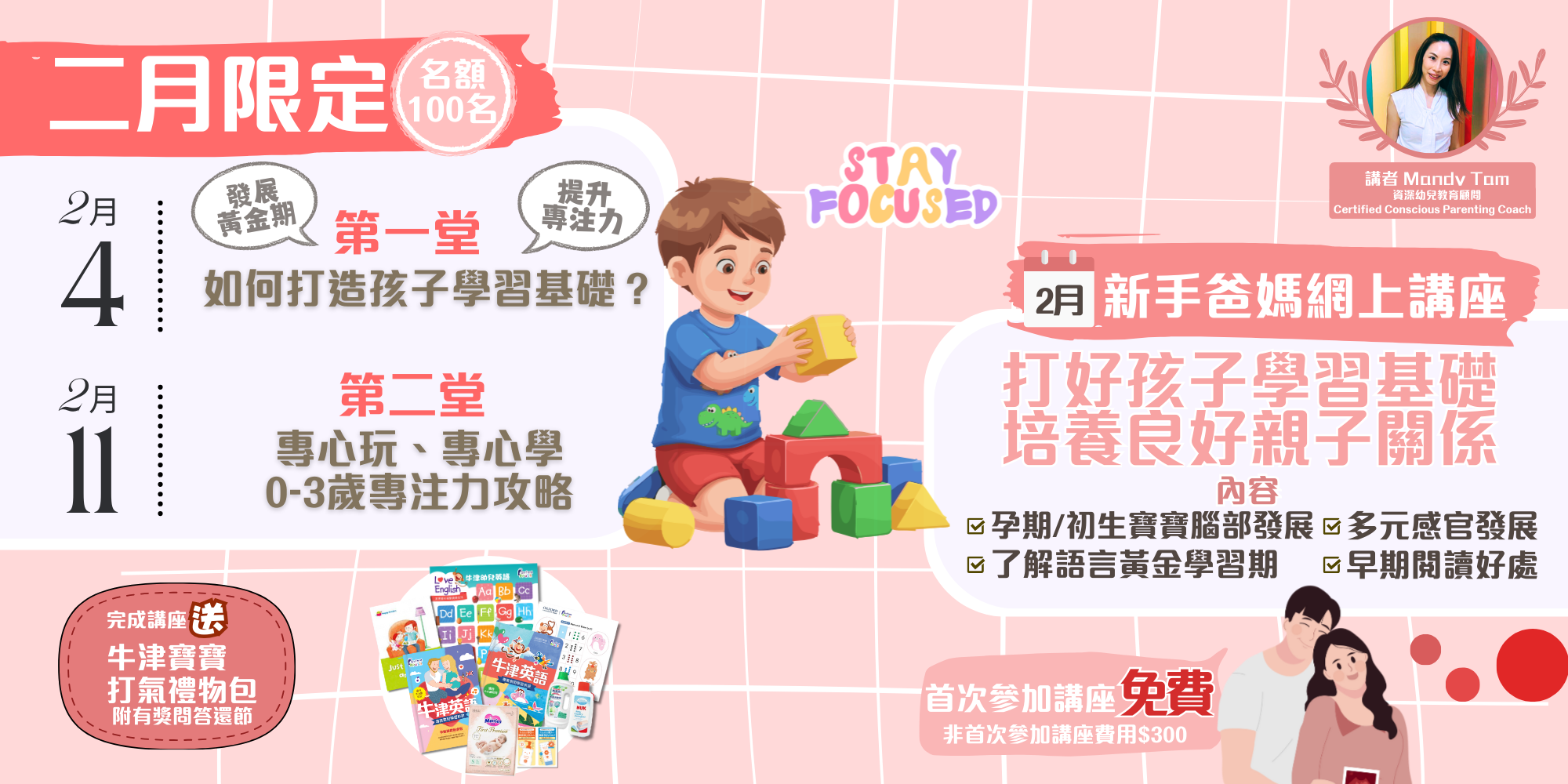 2月份皇牌新手爸媽線上講座,由專家教你從胎教開始打好孩子學習基礎及建立良好親子關係。